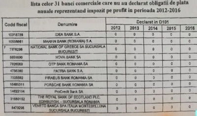 Documentul conține o listă cu 31 de bănci comerciale printre care se regăsesc nume sonore, care nu au declarat obligații de plată anuale reprezentând impozit pe profit în perioada 2012-2016.