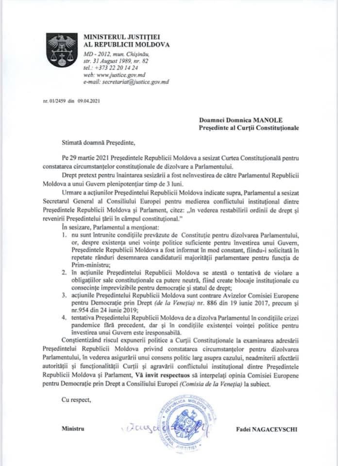 Tot la Curtea Constituțională se apelează din nou. După ce speakerul Zinaida Greceanîi a adresat Curții Constituționale a Republicii Moldova un demers prin care solicită interpelarea avizului amicus curiae al Comisiei de la Veneția în privința sesizării depuse de președintele Republicii Moldova, Maia Sandu, cu privire la constatarea circumstanțelor care justifică dizolvarea Legislativului, cu o altă adresare a venit și ministrul demisionar al Justiției, Fadei Nagacevschi.