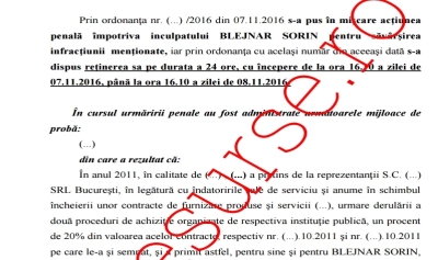 "Banii respectivi urmau să-i fie remişi inculpatului în schimbul exercitării influenţei sale asupra unor subalterni, pentru ca aceşti să gestioneze procedurile de atribuire a contractelor respective astfel încât aceste contracte să fie obţinute de firma omului de afaceri. În aceste circumstanţe, în perioada noiembrie 2011 - ianuarie 2012, inculpatul Blejnar Sorin şi ceilalţi funcţionari implicaţi în acest demers au primit suma totală de 13.172.520 lei, prin intermediul unei firme controlate de aceştia cu care societatea omului de afaceri a încheiat mai multe contracte fictive", se precizează într-un comunicat al DNA.
