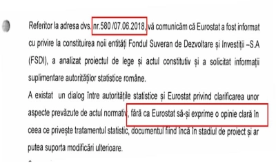 Senatorul PNL, Florin Cîțu, publică corespondența purtată cu Eurostat, în care arată că oficialii europeni nu și-au dat acordul pentru Fondul Suveran de Dezvoltare și Investiții (FSDI), adoptat în Parlament de către majoritatea PSD-ALDE. Cei de la Eurostat precizează faptul că FSDI este în stadiul de analiză, iar în corespondența cu Ministerul de Finanțe nu au exprimat un punct de vedere clar.