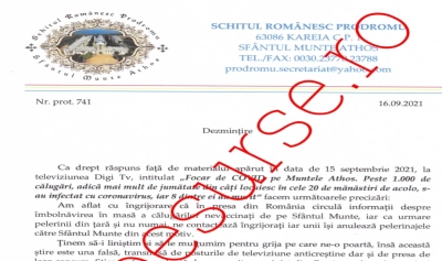 ”Ca drept răspuns față de materialul apărut în data de 15 septembrie 2021, la televiziunea Digi TV, intitulat ”Focar de COVID pe Muntele Athos. Peste 1.000 de călugări, adică mai mult de jumătate din câți locuiesc în cele 20 de mănăstiri de acolo, s-au infectat cu coronavirus, iar 8 dintre ei au murit”, facem următoarele precizări: