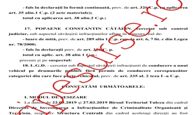 În sarcina inculpaţilor Costinel Tudorel Bobîrnea şi Constantin Cătălin Popaene s-au reţinut infracţiunile de luare de mită şi fals în declaraţii în formă continuată, constând în aceea că, în noaptea de 21/22 martie 2019, în calitate de agenţi ai Serviciului Rutier al Inspectoratului de Poliţie Judeţean Ilfov, aflaţi în exercitarea atribuţiilor de serviciu, au pretins şi primit de la coinculpaţii M.I. şi L.P.R.P. câte 1.000 euro fiecare pentru a nu întocmi dosar penal suspectului, L.G.D., pe care l-au depistat în trafic conducând cu permis necorespunzător categoriei, un autoturism ce tracta o remorcă pe care se afla ambarcaţiunea în care se găsea cantitatea de aproximativ 3 kg cocaină, din marfa recuperată din apele Mării Negre.