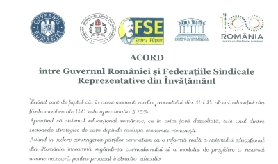 "Acordul între Guvernul României şi Federaţiile Sindicale Reprezentative din Învăţământ, prin care Executivul se angajează să ia măsuri de sprijinire a educaţiei, în concordanţă cu rolul prioritar al acestui domeniu, prevăzut în Programul de Guvernare, a fost adoptat astăzi, prin memorandum, în şedinţa solemnă de la Alba Iulia. La finalul şedinţei, Acordul a fost semnat de premierul Viorica Dăncilă şi de liderii Federaţiilor Sindicale Reprezentative din Învăţământ: Anton Hadăr, preşedintele Federaţiei Naţionale Sindicale Alma Mater, Simion Hăncescu, presedintele Federatiei Sindicatelor Libere din Invatamant, şi Marius Nistor, preşedintele Sindicatului din Învăţământ Spiru Haret", anunţă Executivul.