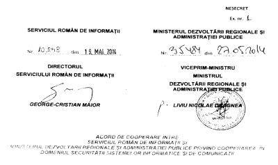 STIRIPESURSE.RO prezintă în premieră documentul integral - "Acord de cooperare între Serviciul Român de Informaţii şi Ministerul Dezvoltării Regionale şi Administraţiei Publice privind cooperarea în domeniul securităţii sistemelor informatice şi de comunicaţii". După acest protocol, a mai fost semnat un acord de cooperare între cele două entităţi, în 2015, pe vremea când ministerul era condus de Sevil Shhaideh. Acest ultim protocol este valabil până în 2020.