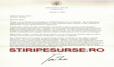 Un grup de români din Statele Unite i-au scris o scrisoare președintelui SUA, Joe Biden, referitor la războiul din Ucraina. Aceștia i-au cerut ca în miezul acestui conflict să nu uite de românii aflați în Ucraina sau în Bucovina, iar președintele SUA le-a răspuns tot printr-o scrisoare. Biden arată faptul că SUA și NATO au impus sancțiuni Rusiei și ajută Ucraina să facă față în acest război, iar sancțiunile generează reale dificultăți economiei Rusiei.