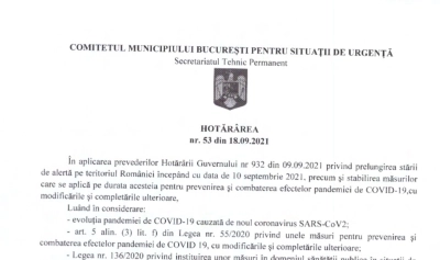 La nivelul Municipiului Bucureşti rata de incidenţă cumulată la 14 zile, în data de 18.09.2021, orele 10 este de 2,33/1000 de locuitori, fapt pentru care, începând cu data de 19.09.2021, ora 00.00 se dispun următoarele măsuri pentru o perioada de 14 zile, urmând a fi reevaluate în funcţie de rata de incidenţă.