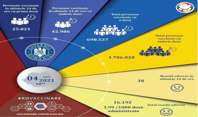 Numărul persoanelor vaccinate de la debutul campaniei în ţara noastră este de 4.404.555. Cele mai multe dintre acestea au fost vaccinate cu serul Pfizer - 3.464.778, 357.314 cu Moderna, 431.482 cu AstraZeneca şi 150.981 cu Johnson & Johnson.