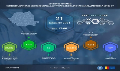 Potrivit Comitetului Național de Coordonare a Activităților privind Vaccinarea împotriva COVID-19 (CNCAV), în ultimele 24 de ore au fost administrate 39.712 doze de vaccin împotriva COVID-19 produs de Pfizer BioNTech la un număr de 39.712 persoane. Dintre acestea, 35.682 persoane au fost vaccinate cu prima doză, iar 4.030 de persoane au fost vaccinate cu două doze.