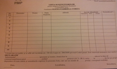 De altfel, în mapa primită de delegații PMP se afla și o listă de semnături pentru candidatura Elenei Udrea la alegerile prezidențiale. Este singura listă primită de delegații PMP, listă pe care au fost sfătuiți să o și semneze.