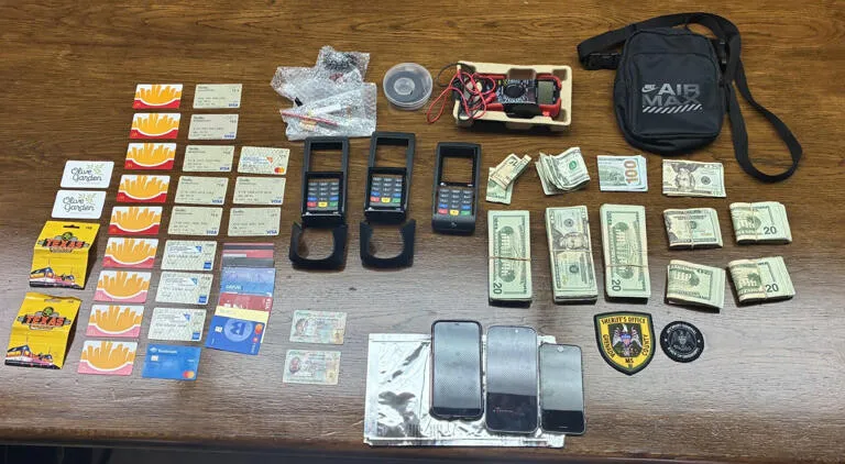În autoturism, anchetatorii au descoperit un compartiment ascuns care conținea dispozitive de skimming, echipamente pentru fabricarea acestora, zeci de carduri și peste 8.000 de dolari în numerar.