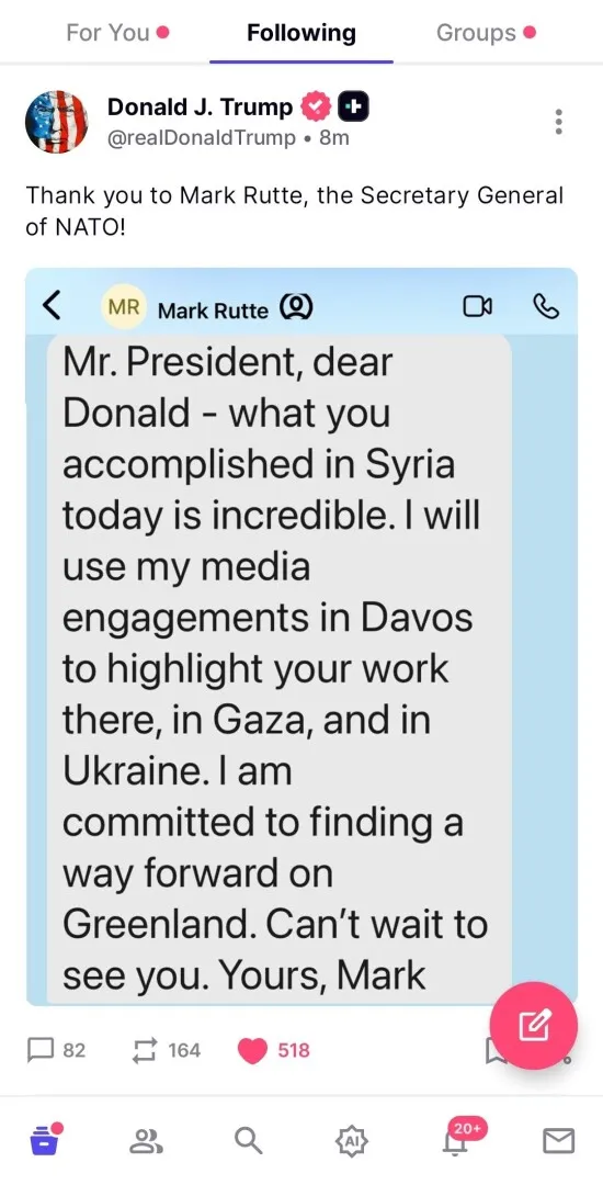 Preşedintele american Donald Trump a divulgat pe reţeaua sa Truth Social un mesaj privat de la secretarul general al NATO Mark Rutte, în care acesta îi salută acţiunea internaţională şi se declară pregătit să facă să avanseze dosarul sensibil al Groenlandei. În cursul zilei de ieri, Donald Trump a publicat și un mesaj primit de la președintele Franței, Emmanuel Macron, informează News.ro.