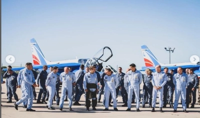 El este surprins purtând un ecuson cu inscripţia ”preşedintele Republicii, Emmanuel Macron, Patrouille de France”, şi o cască la bordul unui avion de tip Alpha Jet şi discutând, în ţinută de aviator, cu piloţi.