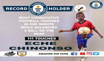 Un puşti de doar 12 ani din Nigeria a intrat în Cartea Recordurilor după ce a ţinut mingea pe picior de 111 ori în timp ce ţinea altă minge pe cap.