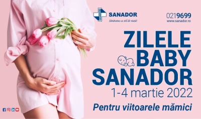 În perioada 1–4 martie 2022, viitoarele mămici beneficiază de reduceri de preț pentru pachetele de naștere disponibile la SANADOR, în cadrul campaniei ZILELE BABY SANADOR. După completarea formularului de aici, viitoarele mămici vor fi apelate, în cel mai scurt timp posibil, de consultanții SANADOR. Aceștia vor răspunde la toate întrebările legate de nașterea la SANADOR și vor oferi detalii legate de reducerile disponibile.