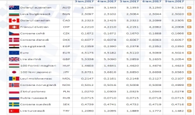 The exchange rate of the national leu currency resulting from the quotations announced on Monday by the banks authorised to operate on the currency market is as follows, according to AGERPRES: