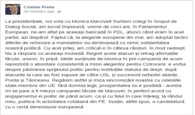 „La prezidențiale, voi vota cu Monica Macovei! Suntem colegi în Grupul de Dialog Social, am lucrat împreună, vreme de cinci ani, în Parlamentul European, ne-am aflat pe aceeași baricadă în PDL, atunci când eram în acel partid, azi dispărut. Faptul că, la alegerile europene din mai, am adoptat tactici diferite de reînnoire a mandatelor nu diminuează cu nimic solidaritatea noastră politică. Cu acel prilej, am criticat-o în câteva rânduri, în mod nedrept. Nu a răspuns cu aceeași monedă. Regret acele atacuri și retrag afirmațiile făcute, uneori, în pripă. Ideile susținute de Monica în pre-campania de acum reprezintă o abordare consistentă a mizei alegerilor pentru Cotroceni: e vorba despre păstrarea sprijinului politic pentru instituțiile statului de drept, după atacurile la care au fost supuse de către USL și succesorii nefastei alianțe, Ponta și Tăriceanu. Regăsim astfel și miza sincronizării noastre cu celelalte state-membre din UE: fără domnia legii, prosperitatea nu e posibilă - acesta mi se pare a fi miezul campaniei făcute de Macovei, în perfect acord cu angajamentul ei politic de până acum, ca și cu felul în care înțeleg, la rândul meu, politica în activitatea cotidiană din PE. Susțin, altfel spus, o candidatură cu o certă dimensiune europeană”, scrie Cristian Preda.