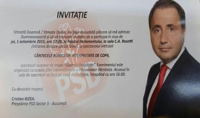 Astazi, 1 octombrie, ora 17:00, cu ocazia "Zilei Internationale a Persoanelor in Varsta", Cristian Rizea si echipa PSD Sector 5, organizeaza pentru un numar de 800 de pensionari, un spectacol la sala "C.A. Rosetti" din Palatul Parlamentului.