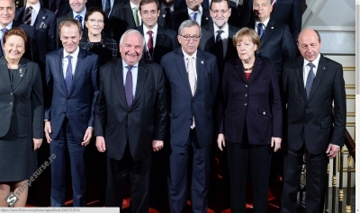 Președintele Traian Băsescu participă la summitul liderilor europeni ai Partidului Popular European. La poza de grup, Traian Băsescu s-a așezat lângă cancelarul Germaniei, Angela Merkel, numai că fotograful l-a prins într-o ipostază deloc fericită.