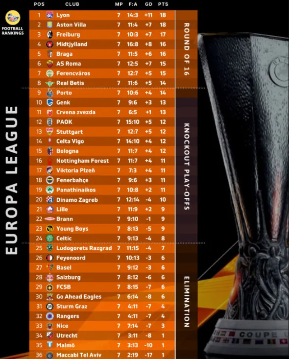 FCSB este pe locul pe locul 29, cu 6 puncte, după victoriile cu Go Ahead Eagles și Feyenoord. Românii sunt la două puncte de locul 24 (Celtic), și sunt obligați să câștige. Depind însă și de rezultatele din celelalte meciuri.