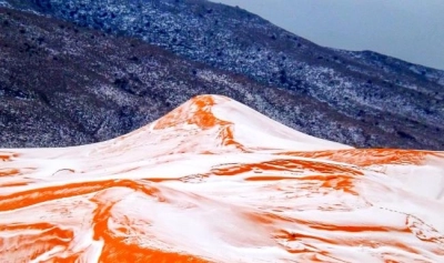 Fotografii publicate pe Twitter din oraşul algerian Ain Sefra, cunoscut ca „Poarta către Deşert”, arată dune roşii de nisipi acoperite cu zăpadă, potrivit News.ro.