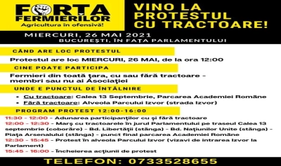 Asociaţia Forţa Fermierilor va organiza miercuri, 26 mai 2021, un marş de protest al tractoarelor în jurul Palatului Parlamentului, tema acţiunii fiind subfinanţarea cronică a sectorului.. Protestul va fi organizat exact în momentul în care premierul Florin Cîțu va prezenta Programul Național de Reziliență și Redresare în Parlament.