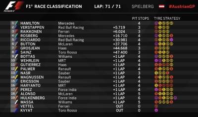 Hamilton a parcurs cei 307,020 km ai cursei în 1h27min38sec107/1000, fiind urmat la mai mult de 5 secunde de Verstappen și la mai mult de 6 de Raikkonen.