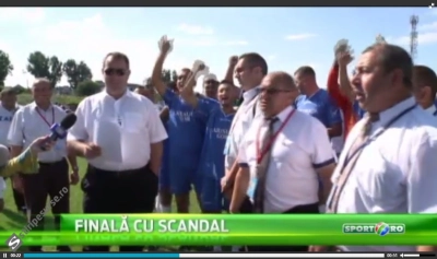 Finala rromilor la fotbal s-a jucat pentru un trofeu de AUR de doua kilograme pe masa! Meciul a inceput si s-a terminat insa cu scandal. Trofeul imens din aur si argint a fost pazit de jandarmi. Finaliste au fost echipele din Târgu-Jiu și din Sibiu, iar returul s-a jucat, cu trofeul pe masă, în orașul președintelui Klaus Iohannis.