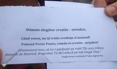 Un răvaș distribuit la Mănăstirea Cozia arată că preoții recomandă credincioșilor să nu-și trădeze țara și neamul și să voteze cu Victor Ponta.