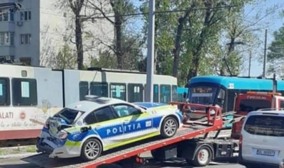 O mașină de poliție care avea semnalele luminoase în funcțiune a fost lovită, miercuri, de un tramvai condus de o femeie într-o intersecție din Galați.