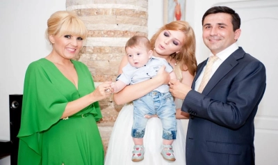 "Cu finuţul meu, George şi, cu părinţii lui Cecilia şi Adrian. Un copil cuminte tare şi frumos ca în reclamele de pampers, cu care m-am împrietenit de la prima vedere. Urmează botezul"