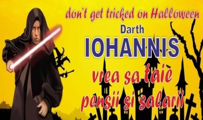 Alaturi de sloganul "Don't get tricked on Halloween (n.r. nu fi pacalit de Halloween). Darth Iohannis vrea să taie pensii şi salarii", Iohannis apare cu o sabie laser in mana, pregatit parca sa taie tot ce ii iese in cale, potrivit presei locale.