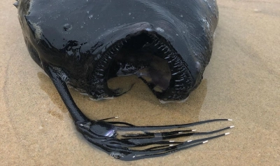 Un peşte monstru, cu dinţi ascuţiţi ca sticla, a fost găsit pe o plajă din California săptămâna trecută, scrie CNN. Creatura neagră, găsită cu gura deschisă, zăcea pe nisipul dintr-o zonă protejată a Pacificului.