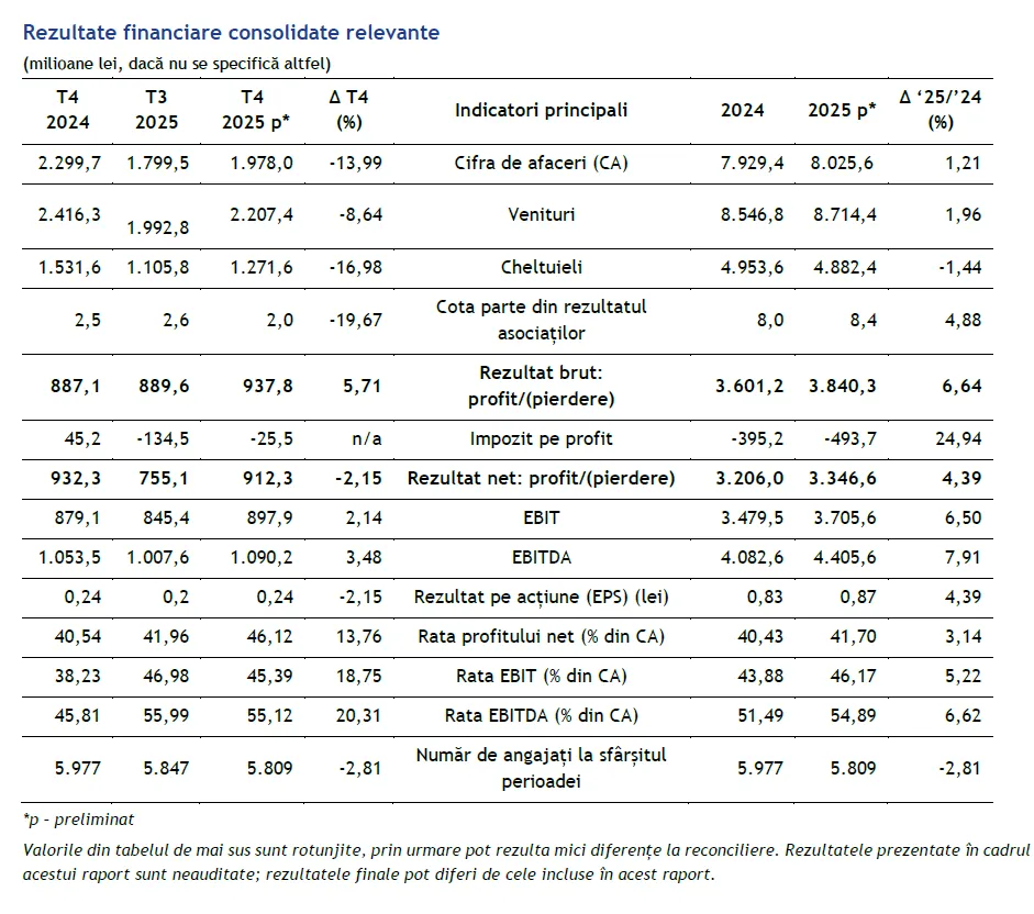 Comparativ cu trimestrul al treilea din 2025, cifra de afaceri din trimestrul al patrulea a fost mai mare cu aproape 10%, semnal că finalul de an a adus un plus de dinamică în activitatea grupului.