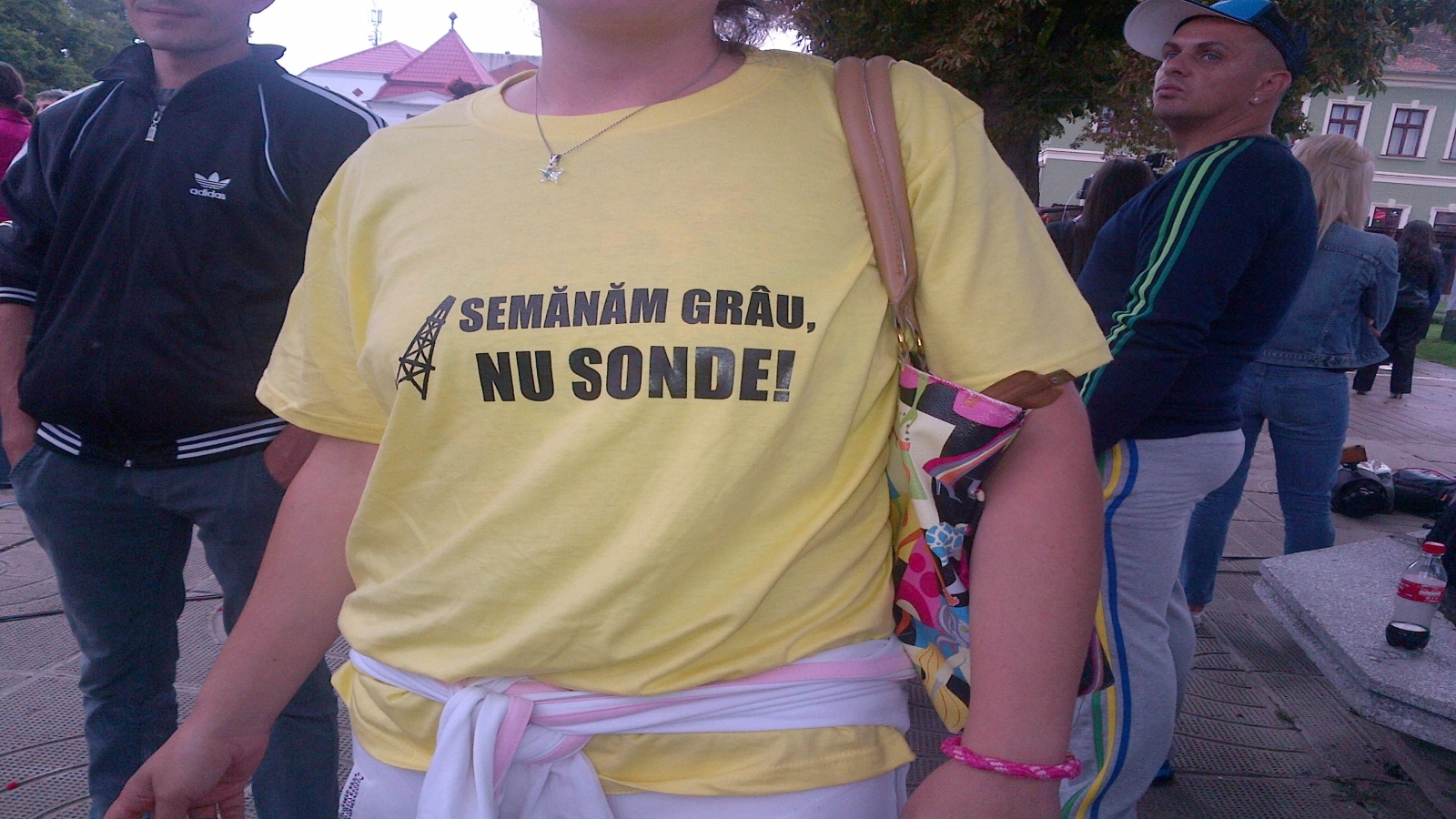 Protestatarii îl așteaptă pe Traian Băsescu cu tricouri pe care este inscripționat mesajul ”Semănăm grâu, nu SONDE!”. Aceșția i-au pregătit lui Traian Băsescu și un pachet special în care i-au pus un tricou și materiale de informare împotriva exploatării gazelor de șist.