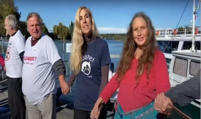 Timp de aproape 30 de minute, manifestanţii s-au adunat pe malurile acestui lac situat între Germania, Elveţia şi Austria.
