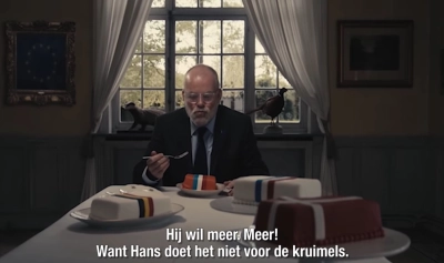 În alte scene, Hans merge la toaletă şi are probleme în a urina. Când trage apa, lanţul de la toaletă are forma premierului olandez, Mark Rutte. Hans se mai joacă cu tancurile şi mănâncă un tort de portocale care simbolizează Olanda.