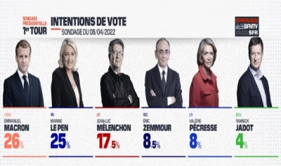 Cei doi concurenți sunt în frunte și, de departe, de când Jean-Luc Mélenchon se află pe locul trei, cu 17,5%. Eric Zemmour ar obține 8,5%, Valérie Pécresse, 8%, Yannick Jadot, 4%, Nicolas Dupont-Aignan, 1,5%, Fabien Roussel, 2,5%, Jean Lassalle, 2,5%, Anne Hidalgo, 2%, Philippe Poutou, 1% și Nathalie Artaud, 0,5%.