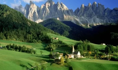 Imaginea surprinde zona Val di Funes din nordul Italiei, cu masivul Odle în fundal – un peisaj emblematic al Dolomiților. Fotografia a fost utilizată în postare alături de obiective cunoscute din România, precum Castelul Corvinilor, Castelul Bran, Transfăgărășanul sau Chipul lui Decebal.