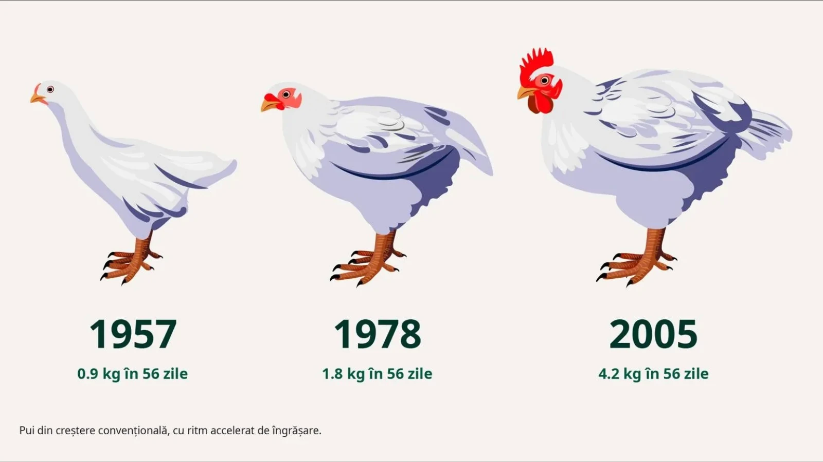 Aproape 90% dintre puii crescuți pentru carne în Uniunea Europeană provin din sisteme intensive de interior, în care zeci de mii de păsări sunt înghesuite în hale suprapopulate. În plus, sunt selectate rase care cresc atât de repede încât suferă frecvent de afecțiuni ale membrelor și dificultăți de mers. Aceste păsări, cunoscute în industrie sub numele de “pui broiler”, sunt cele mai numeroase animale de fermă din lume. Cu toate acestea, legislația învechită încă permite creșterea lor în aceste sisteme de producție, unde duc o viață de suferință din cauza ritmului de creștere rapid și nesănătos, a suprapopulării, a mediilor lipsite de stimuli și a metodelor de sacrificare inumane.