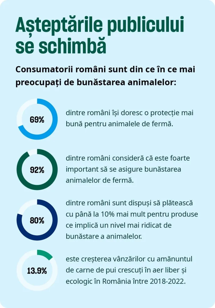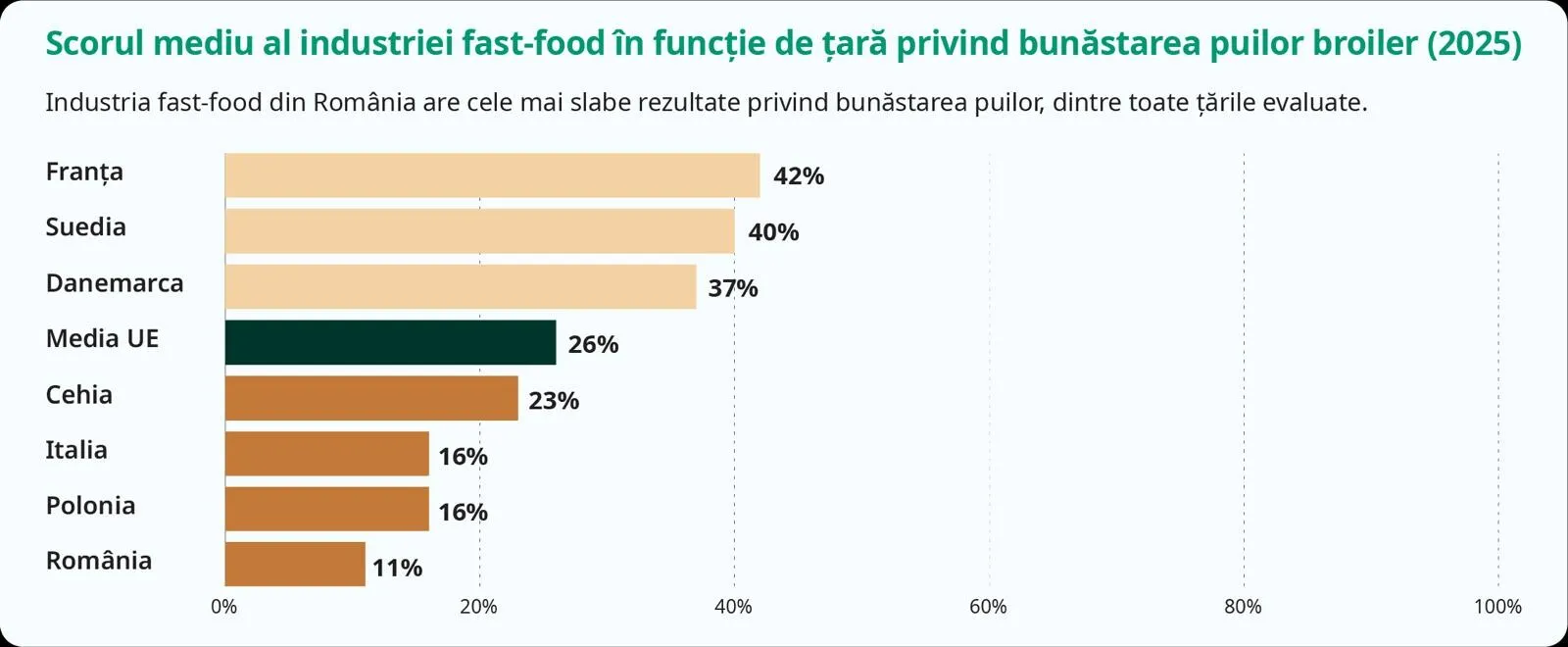 Rezultatele arată că lanțurile de fast-food trebuie să adopte de urgență standarde crescute de bunăstare pentru păsările din lanțurile lor de aprovizionare, având în vedere magnitudinea industriei: în 2024, 6,7 miliarde de pui au fost sacrificați pentru carne în Uniunea Europeană, cu 320 de milioane provenind din România, conform datelor furnizate de Organizația Națiunilor Unite pentru Alimentație și Agricultură, 2025.