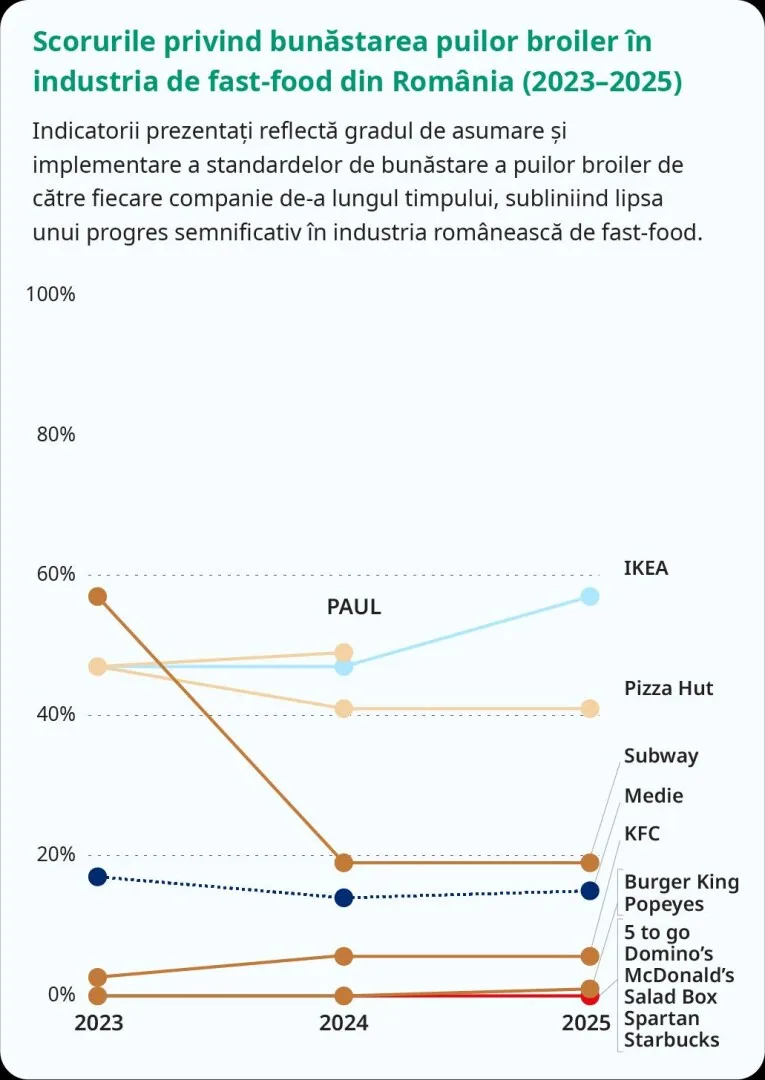 Ediția din 2025 a analizat 12 mari lanțuri de fast-food active în țara noastră, iar rezultatele cheie relevă o diferență între angajamentele globale pentru bunăstarea animalelor din partea companiei-mamă și implementarea locală. Din nou, IKEA conduce clasamentul datorită angajamentului său clar față de ECC, dar și a faptului că a publicat un plan de parcurs și termene limită. Însă IKEA nu este transparentă în ceea ce privește progresul în implementare. Urmează Pizza Hut care are un angajament față de ECC, dar nu prezintă un raport privind implementarea promisiunilor. Pe locul trei este Subway: politica sa ECC este doar parțial aliniată, după renunțarea la termenul limită din 2026. Kentucky Fried Chicken are o politică proprie care nu îndeplinește standardele de bază ale ECC și compania nu raportează nimic în privința progreselor. Celelalte branduri internaționale și naționale (Burger King, Domino’s Pizza, McDonald’s, Popeyes, Starbucks, 5 to go, Salad Box și Spartan) au scoruri între 0% și 1%, pentru că nu au niciun angajament pentru bunăstarea puilor crescuți pentru carne.