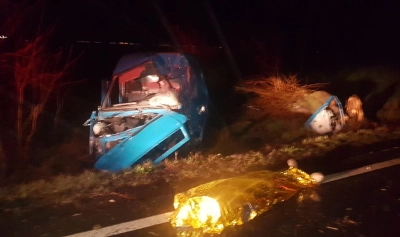 Doi bărbaţi şi-au pierdut viaţa, iar alţi doi au fost răniţi grav, în urma unui accident rutier produs, joi seară, pe DN 79, în judeţul Arad, un autoturism lovind una dintre victime în timp ce se deplasa pe jos pe marginea drumului, după care a părăsit partea carosabilă şi s-a izbit de un copac.