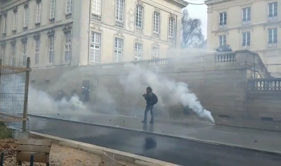 Un martor citat de Reuters a declarat că poliţia a folosit gaze lacrimogene pentru a dispersa un grup de protestatari cu glugi şi măşti pe feţe. Unii protestatari care purtau glugi sau veste galbene au răspuns aruncând proiectile în direcţia forţelor de ordine. În imaginile difuzate de o televiziune se putea vedea o dubiţă cu geamurile sparte.