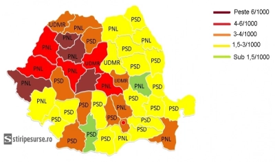 STIRIPESURSE.RO vă prezintă harta incidenţei cazurilor de COVID-19 la 11 noiembrie 2020, corelată cu apartenenţa politică a conducerii consiliilor judeţene.