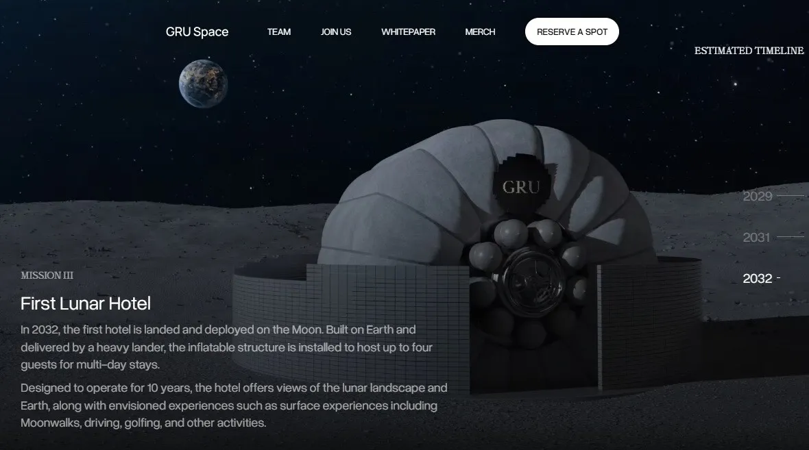 GRU Space afirmă că își propune să ducă mai departe acest vis, anunțând construirea primului hotel lunar și lansarea primelor călătorii peste aproximativ șapte ani. Compania vizează o nișă exclusivistă a ospitalității de lux, într-un context în care infrastructura spațială necesară este, în mare parte, încă la nivel teoretic.