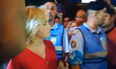 După mai multe minute în care echipa televiziunii a fost înconjurată de oameni care îi huiduiau au venit şi câţiva jandarmi care i-au înconjurat pe cei de la Antena 3.