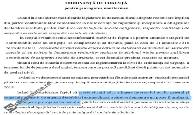 De asemenea, sunt luate în calcul "situaţia obiectivă creată de reglementarea la nivel de ordonanţă de urgenţă a termenului de depunere a declaraţiei, termen care nu poate fi modificat decât printr-un act normativ de acelaşi nivel" şi "necesitatea ca măsura prorogării să fie adoptată anterior expirării perioadei până la care contribuabilul poate să-şi îndeplinească obligaţiile declarative, respectiv 31 ianuarie 2018".