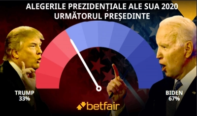 Candidatul Democrat Joe Biden și-a mărit avantajul în cursa pentru Casa Albă, iar cotele oferite de Betfair Exchange arată că are de două ori mai multe șanse de câștig decât Donald Trump, cu doar trei săptămâni înainte de alegerile pentru Președinția Statelor Unite ale Americii, programate pe 3 noiembrie. Biden este favorit cu cota 1.49 (șansă de 67%), în timp ce actualul Președinte are o cotă de 3.05 (33%).