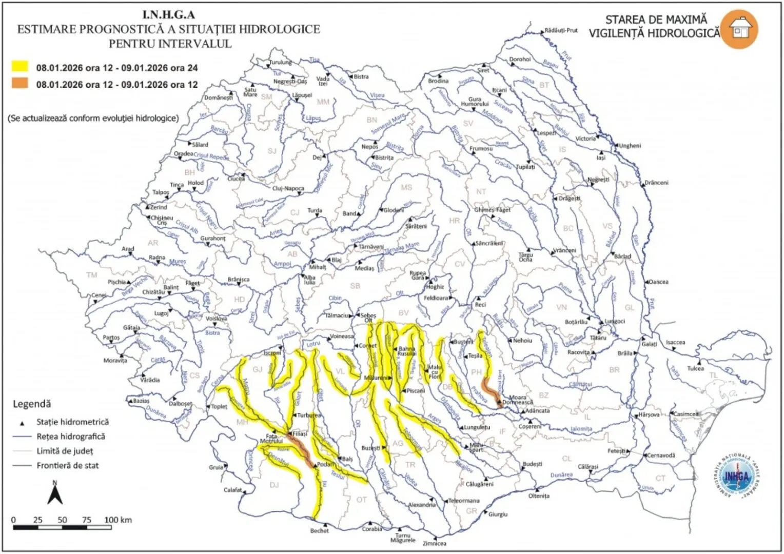 În intervalul 8 ianuarie ora 12:00 – 9 ianuarie ora 12:00, pe râul Jiu pe sectorul aval confluență cu râul Motru – amonte Stația Hidrologică Podari din județul Dolj și pe râul Teleajen pe sectorul aval confluență cu râul Vărbilău din județul Prahova se pot produce viituri cu posibile depășiri ale cotelor de apărare.