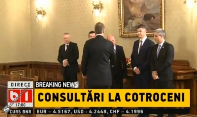 Traian Băsescu, Eugen Tomac, Valeriu Steriu, Cristian Diaconescu şi Robert Turcescu fac parte din delegaţia Partidului Mişcarea Populară participă, la Cotroceni, la prima rundă de consultări cu partidele politice după alegerile parlamentare iniţiată de preşedintele Klaus Iohannis.